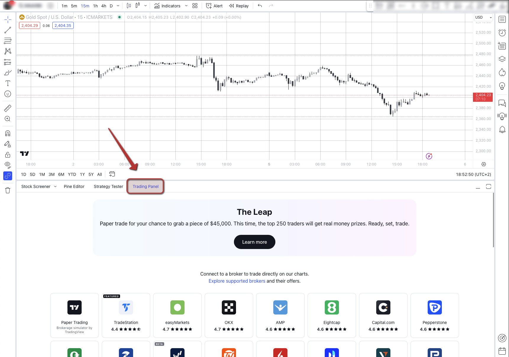 Once you're signed in, open a full chart. Then, navigate to the Trading Panel, which you can find at the bottom of the screen.