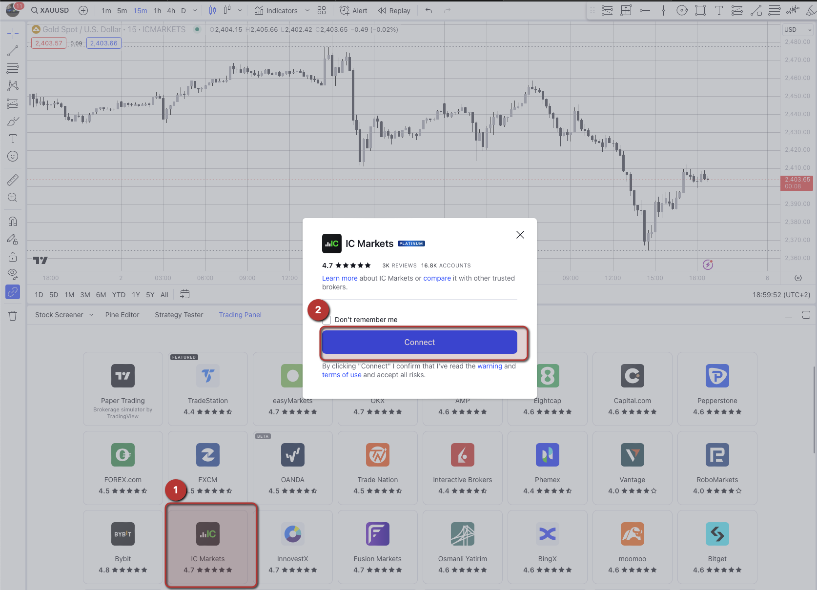 2. If you've found your broker, click on it, and a new window will appear. For this documentation, we've used IC Markets as an example.