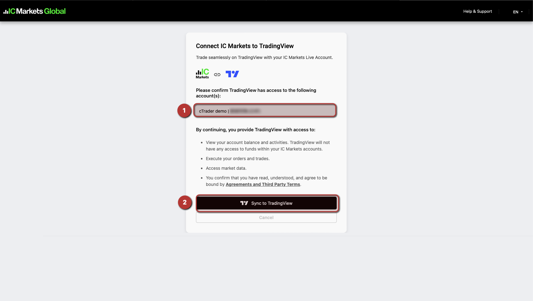 After entering your credentials, a new cTrader account with your broker will be opened. You will then have the option to sync with TradingView; click on it.
