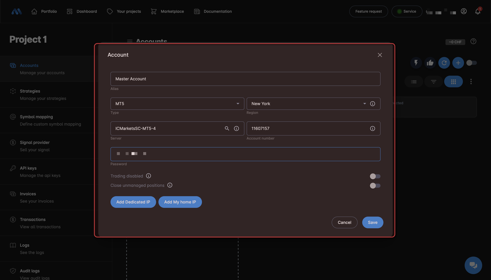 A new window will open where you have to enter the data of the trading account.